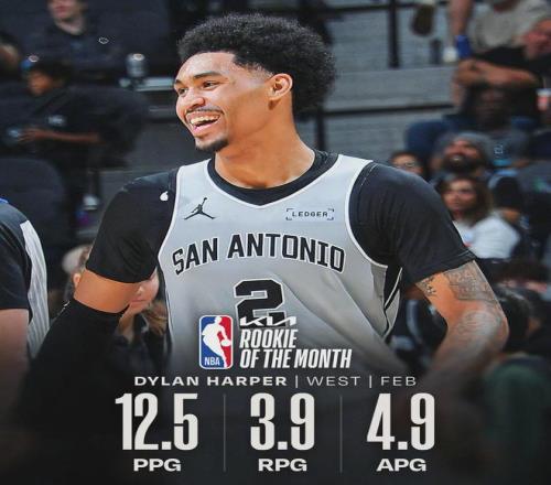 剛剛過去的2月份,馬刺11勝0負,聯(lián)盟最佳戰(zhàn)績,文班亞馬場均22.5分11.3籃板3.5蓋帽。全明星之后文班一共送出26記蓋帽,籃網(wǎng)全隊只有24記蓋帽,雄鹿全隊23記蓋帽。哈珀在2月份場均12.5分3.9籃板4.9助攻,投籃命中率55.4%。