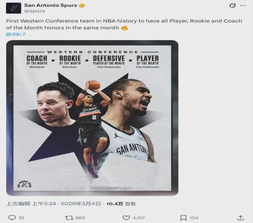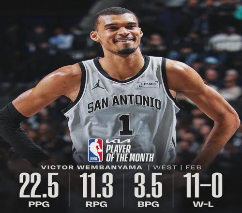 此外,文班亞馬和德里克-懷特分別當選西部和東部二月份最佳防守球員。“月最佳防守球員”是從2024-25賽季開始設(shè)立的一個新獎項,但月最佳球員、教練和新秀的獎項由來已久。馬刺成為NBA史上第一支包攬西部這三大獎項的球隊。