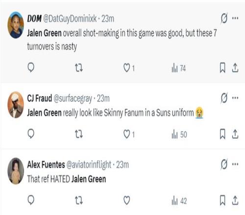 太多的太陽球迷炮轟杰倫-格林失誤率過低+效率值低,本賽季格林場均13.5分,命中率36.7%,三分命中率27.6%。