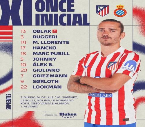 馬競(jìng)首發(fā):13-奧布拉克、14-馬科斯-略倫特、18-普維爾、17-漢茨科、3-魯杰里、20-小西蒙尼、5-卡多佐、10-巴埃納、22-盧克曼、7-格列茲曼、9-瑟洛特