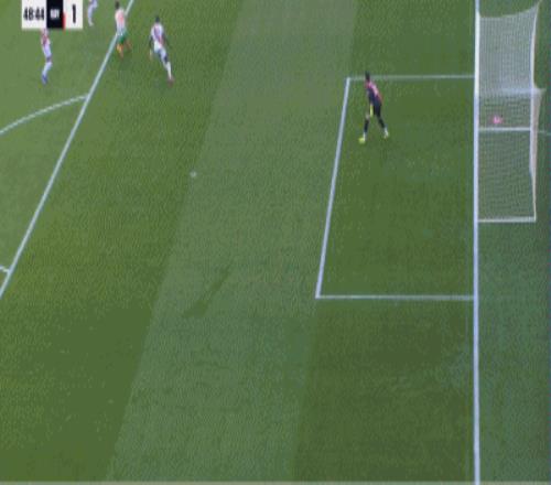 第35分鐘,安東尼禁區(qū)內(nèi)過(guò)掉對(duì)手嘗試射門,皮球打偏