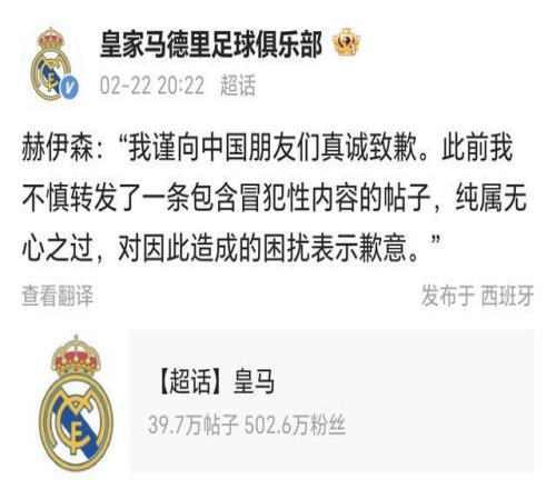 2月22日,皇馬官方微博超話發布一則消息,疑似為赫伊森進行道歉。但是,皇馬官網和赫伊森個人社媒并無相關內容。