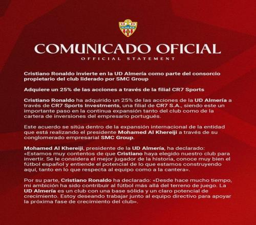 C羅宣布收購了阿爾梅里亞25%的股份,成為了俱樂部的股東之一,從目前的消息來看,C羅應該是不會參與到俱樂部的實際運營當中,他更多是暫時以一個投資者的身份進行的收購,不過關于C羅的投資細節以及投資的金額并沒有太多的信息。阿爾梅里亞這支球隊關注西甲的球迷還是非常熟悉的,他們算是比較有名的西甲升降機,多次升入西甲聯賽但是也多次降級。