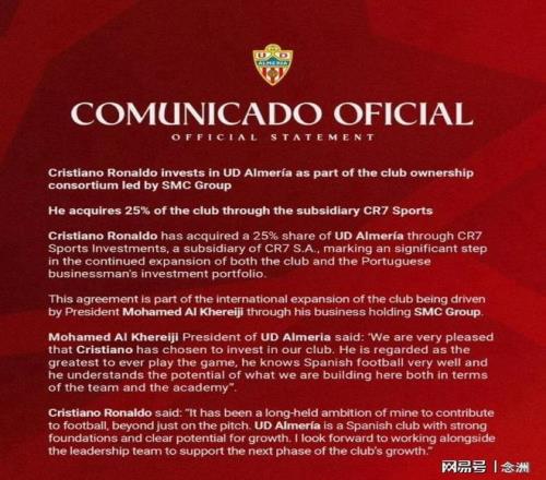 C羅發(fā)布聲明稱:“長(zhǎng)期以來,我一直有志于在球場(chǎng)之外為足球做出貢獻(xiàn)。阿爾梅里亞是一家擁有堅(jiān)實(shí)基礎(chǔ)和明顯成長(zhǎng)潛力的西班牙俱樂部。我希望能與管理團(tuán)隊(duì)合作,支持俱樂部進(jìn)入新的成長(zhǎng)階段。”