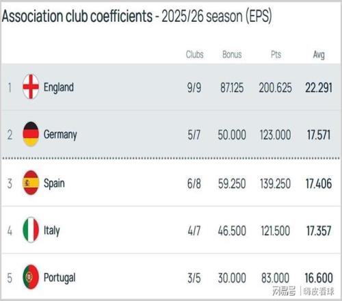 隨著多特蒙德附加賽出局,德甲積分增長有限,盡管國際米蘭和尤文圖斯在歐冠出局,不過亞特蘭大、博洛尼亞和佛羅倫薩,都順利通過附加賽,積分增加不少。因此,意甲雖然表現不佳,仍能大大縮小與前方的差距。從最新積分榜來看,德甲、西甲和意甲,三大聯賽相差不到0.2分,其實就是一場比賽勝負的差距。