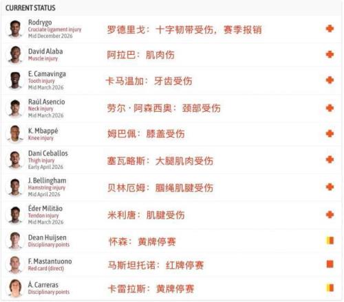 除了姆巴佩和羅德里戈,皇馬傷病名單還包括勞爾·阿森西奧、米利唐、阿拉巴、貝林厄姆、塞瓦略斯、卡馬溫加等人,前中后三條線都有重要主力球員缺陣,其中阿拉巴和羅德里戈一樣,都是在對赫塔費一戰中受傷。呂迪格則用膝蓋粗野頂撞對手迭戈·里科頭部,雖然比賽時逃過一劫,但賽后幾乎全世界都對他進行聲討,呼吁對當值裁判停哨,對呂迪格追加停賽。