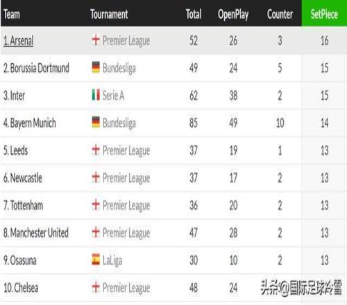 本輪賽前,國米依靠角球、任意球攻入13個聯賽入球,是五大聯賽所有球隊中排名第四的球隊,僅少于阿森納(16)、多特蒙德(15)、拜仁(14)三隊。本戰依靠定位球攻入2球后,國米已是五大聯賽球隊里依靠定位球破門第二多的球隊,也就只落后阿森納這一支球隊了。