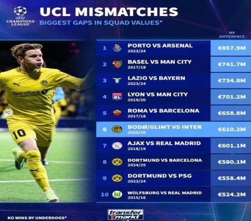 這場失利,也是歐冠歷史上極具代表性的以弱勝強(qiáng),位列歐冠歷史以弱勝強(qiáng)第六大身價差。面對實力、名氣、財力都遠(yuǎn)勝自己的對手,博德閃耀用兩場穩(wěn)健而高效的表現(xiàn)贏得尊重。