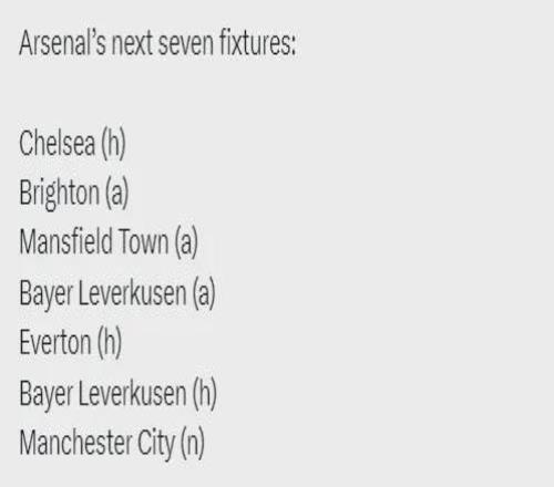 阿森納未來7場比賽:主戰切爾西、客戰布萊頓、客戰曼斯菲爾德、客戰勒沃庫森、主戰埃弗頓、主戰勒沃庫森、聯賽杯決賽對曼城
