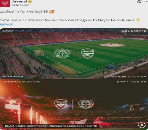 官方:阿森納將在歐冠八分之一決賽中對陣勒沃庫森。兩回合比賽阿森納先客后主,槍手將在3月11日周三前往德國踢...