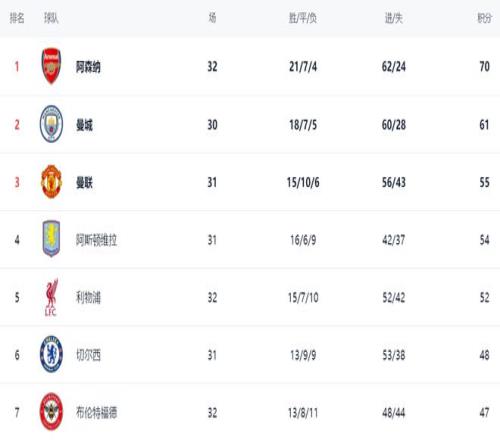 在積分榜上,落敗的阿森納依然占據(jù)榜首位置。阿森納總積分是70分。曼城排名第2,拿到61分,落后阿森納9分。不過(guò),曼城比阿森納少踢2場(chǎng)。冠軍的歸屬還有懸念。曼聯(lián)以55分排名第3。第4的是阿斯頓維拉,拿到54分。利物浦贏球之后,總積分達(dá)到52分,排名第5。切爾西48分排名第6。熱刺的戰(zhàn)績(jī)是7勝9平15負(fù),只拿到30分,掉入降級(jí)區(qū),排名第18。