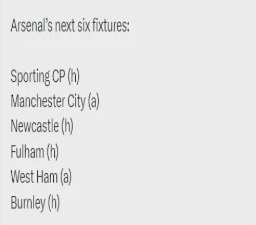 阿森納未來6場比賽:主戰葡萄牙體育、客戰曼城、主戰紐卡斯爾、主戰富勒姆、客戰西漢姆、主戰伯恩利。