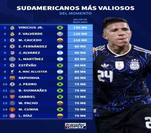 德國轉會市場列出了南美球員身價排名,維尼修斯1.5億歐居首,巴爾韋德1.2億歐次席。南美球員德轉身價榜: