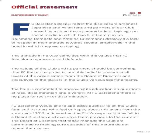 2019年巴薩亞洲行期間,格列茲曼和登貝萊有種族歧視行為,巴薩在官網(wǎng)發(fā)布道歉聲明:“一段我俱樂部兩名球員用輕佻和缺乏尊重的語言稱呼他們所住的酒店員工的視頻流傳出來,引起了日本球迷、亞洲球迷以及我們的合作伙伴的不滿。巴塞羅那俱樂部對此不滿表示理解并深表遺憾,向每一個因為2019年亞洲行感到不快的球迷和成員們道歉。”格列茲曼和登貝萊本人也在外國社媒上公開道歉。