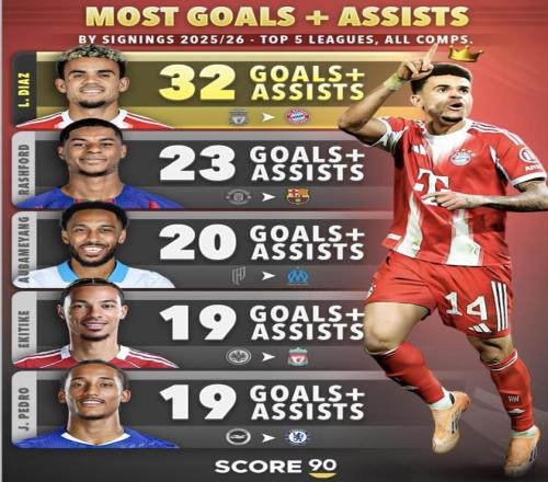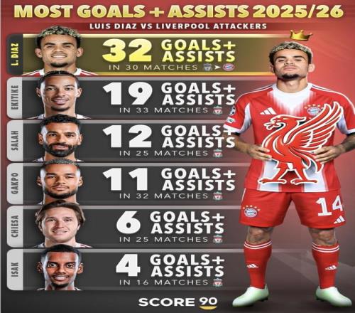 最近Score 90整理了2025/26賽季的進球加助攻榜,迪亞斯這份30場32次的數據一下把對比拉滿:同一份統計里,利物浦...