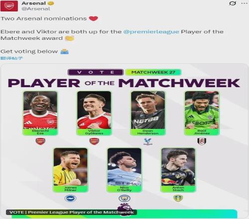 官方:埃澤和哲凱賴什都被提名為了英超上周最佳球員候選。