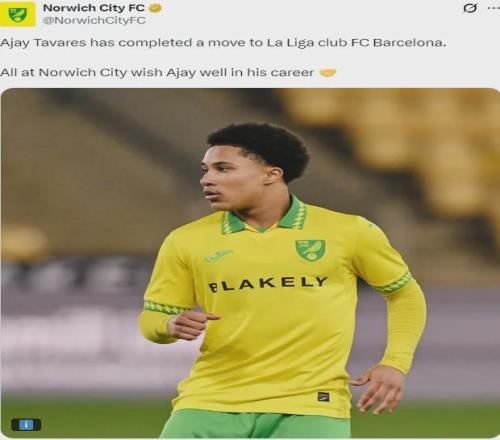 官方:諾維奇宣布年輕的邊鋒阿賈伊-塔瓦雷斯轉會加盟了巴薩。