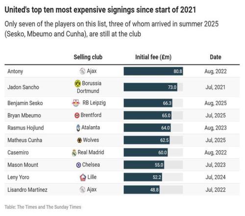 報告指出,從2021年初至2025年底,曼聯(lián)在轉(zhuǎn)會市場上的凈支出達(dá)到7.94億歐元(約6.92億英鎊)。這一數(shù)據(jù)凸顯了球隊在此期間競技表現(xiàn)不佳所付出的高昂代價。根據(jù)《2025俱樂部財務(wù)與投資格局報告》,凈支出排名第二的是切爾西足球俱樂部(6.56億英鎊),第三為阿森納足球俱樂部(5.87億英鎊)。