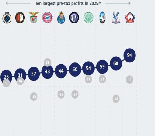 歐足聯(lián)統(tǒng)計(jì)2025年歐洲稅前盈利最多的10家俱樂部: