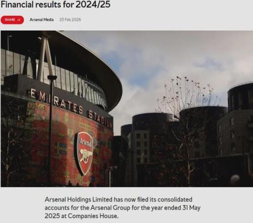 官方:阿森納控股有限公司公布了俱樂部24-25賽季的財報。