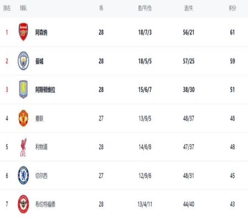 在積分榜,阿森納依然占據榜首位置,18勝7平3負的戰績,拿到61分。贏球的曼城步步緊逼。曼城總積分達到59分,排名第2,僅僅落后阿森納2分。冠軍的爭奪太激烈了,最快下一輪曼城有機會登頂。阿斯頓維拉則不斷掉鏈子,總積分依然是51分,排名第3。曼城以48分排名第4。利物浦贏球之后,也是48分,排名第5。切爾西只拿到45分,掉到第6名。