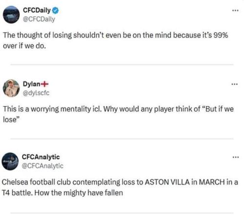 另一位球迷寫道:“切爾西足球俱樂部竟然在三月的第四名爭奪戰中考慮輸給阿斯頓維拉的可能性。強者是如何衰落的?”