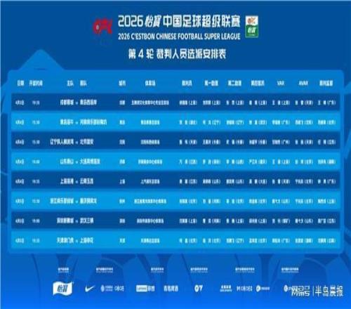 中超第四輪裁判選派結果3日公布,大連英博客場與山東泰山一戰將由萬濤主哨,視頻助理裁判為王迪。本輪共有5個賽區啟用視頻裁判遠程中心,其中包括山東賽區。中超官方列舉了兩場焦點比賽,分別為山東泰山對大連英博、浙江對重慶銅梁龍。