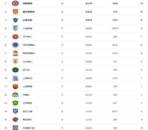 第5輪之后,成都蓉城、重慶銅梁龍、上海申花保持不敗,成都蓉城以13分領(lǐng)跑中超積分榜,重慶銅梁龍(11分)、云南玉昆(9分)、大連英博(9分)分別排名第2到第4位。