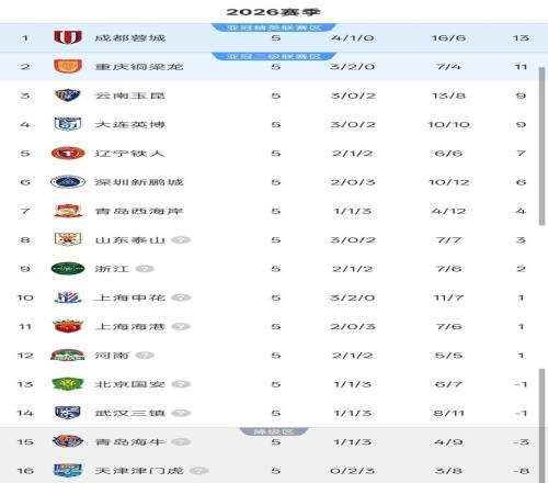 至此,第5輪比賽全部結束,5輪過后僅剩成都蓉城、重慶銅梁龍、上海申花保持不敗,不過3支球隊的排名差異很大。