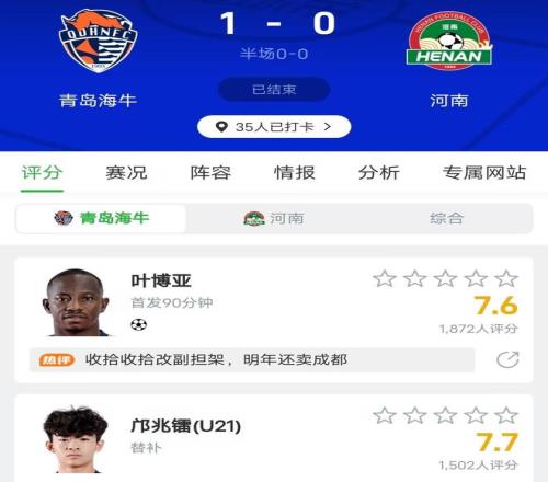 青島海牛所有登場球員中,外援葉博亞的評分最高,為7.5分,李蘇達(dá)得到6.9分,是本土球員中最高。顯然這些評分都在合理范圍內(nèi),讓人疑惑的是,一分鐘都未能登場的鄺兆雷卻吊打全隊(duì)隊(duì)友,以8.2分遙遙領(lǐng)先。