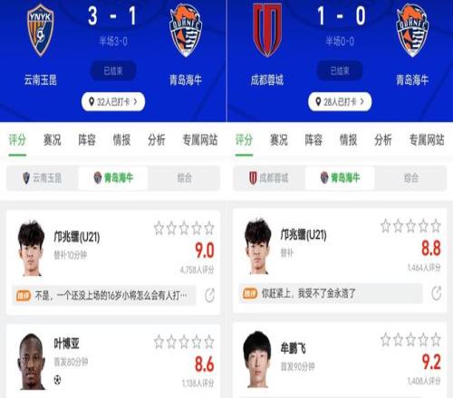 本賽季中超第一輪云南玉昆3比1青島海牛,鄺兆雷替補(bǔ)出場踢了10分鐘,賽后評分高達(dá)9.0。第二輪成都蓉城1比0青島海牛,鄺兆雷的評分低調(diào)了一點(diǎn),但還是以8.8分高居全隊(duì)第二(上圖),僅次于表現(xiàn)出色的門將牟鵬飛。